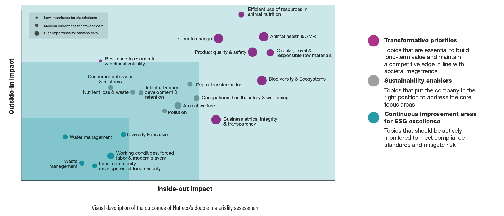 In anticipation of the sustainability reporting requirements outlined in the EU Directive in the CSRD, which will be in force for disclosures related to 2024, Nutreco decided in 2022 to move forward and perform a materiality assessment taking into account the double materiality principle. Double materiality in reporting accounts not only for how a company affects the environment and society, but also how the environment and society impact the company’s financial value. A sustainability topic meets the criteria of double materiality if it is material from the impact perspective (inside-out) and from the f inancial perspective (outside-in).