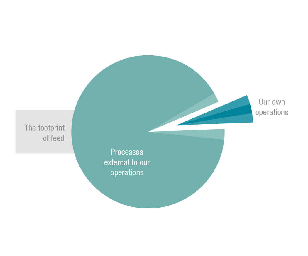 The true carbon footprint of one kilogram of aquaculture feed includes not only the direct emissions resulting from the manufacturing process and the transportation of the feed to the farm. It also includes a whole host of indirect emissions, such as those caused by growing the crops used in the feed, processing of feed ingredients, mining activities, production of vitamins, transport of the raw materials and so on. These are just a few of the processes involved. If you think about it, tracing back all the things that have to happen to make that feed leads to nearly an infinite number of pathways. In order to reduce the carbon footprint, we must look for reductions along the whole value chain.