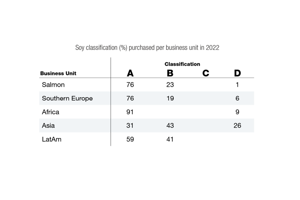 We have set intermediate goals towards a deforestation-free supply chain by the end of 2025. In 2022, we committed to only source Class A, B or C. This means that we will not source from high risk countries without relevant certifications. In many cases we covered this intermediate goal by purchasing Round Table on Responsible Soy Association (RTRS) credits for our high deforestation risk soy volumes. Through the purchase of RTRS credits, we support farmers that are deforestation free. Unfortunately, 3% of our total soy purchases originated from high risk regions without any certification making these volumes non-compliant with our sourcing policy’s 2022 goals.