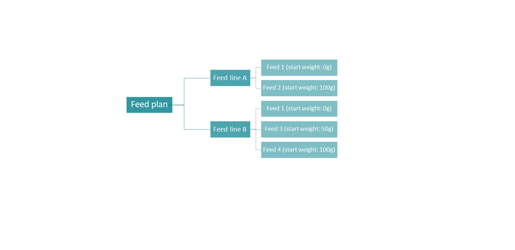 For each feed plan, there needs to be at least one feed line. It is possible to only use one feed line. The first feed line added to a feed plan is called ‘base feed line’, and in this case, AquaSim will only use the feeds from this one single feed line based on the weight of the animals.
