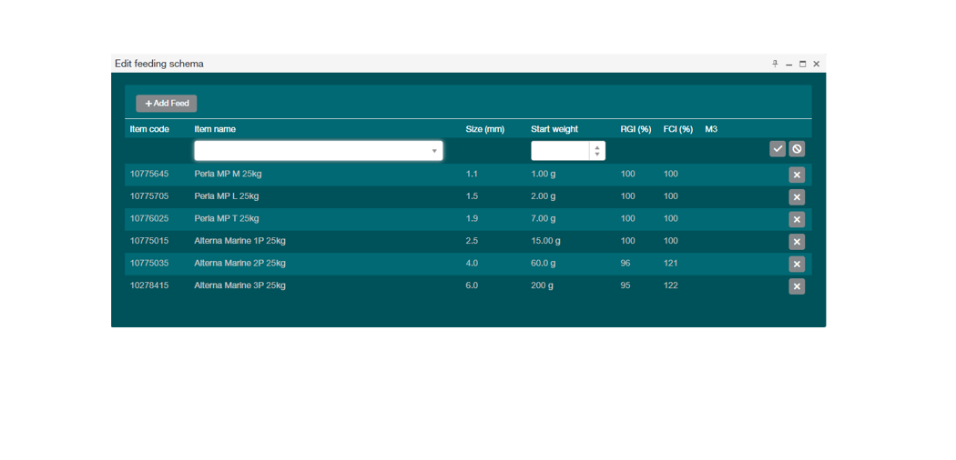 A feed line is usually a product line, which consists of the feeds from the same product family, but different in pellet sizes and suitable for different weights of the animals. Feed items are set up by Skretting administrators in advance, so please contact your local representatives if there is any question.