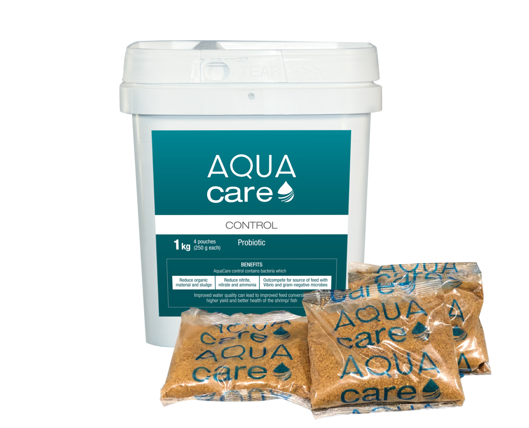 AquaCare Control is a probiotic solution, its formulation is designed to improve water quality, support growth and feed conversion ratio for shrimp and fish. It is a combination of synergetic beneficial bacteria and micronutrients on a carbon rich carrier. It works preventatively, with the objective to load the water in pond farming systems with beneficial bacteria that prevent the same space from being occupied by potentially harmful bacteria. These bacteria are specifically selected to provide an effective and versatile solution for water bioremediation in all aquaculture conditions.