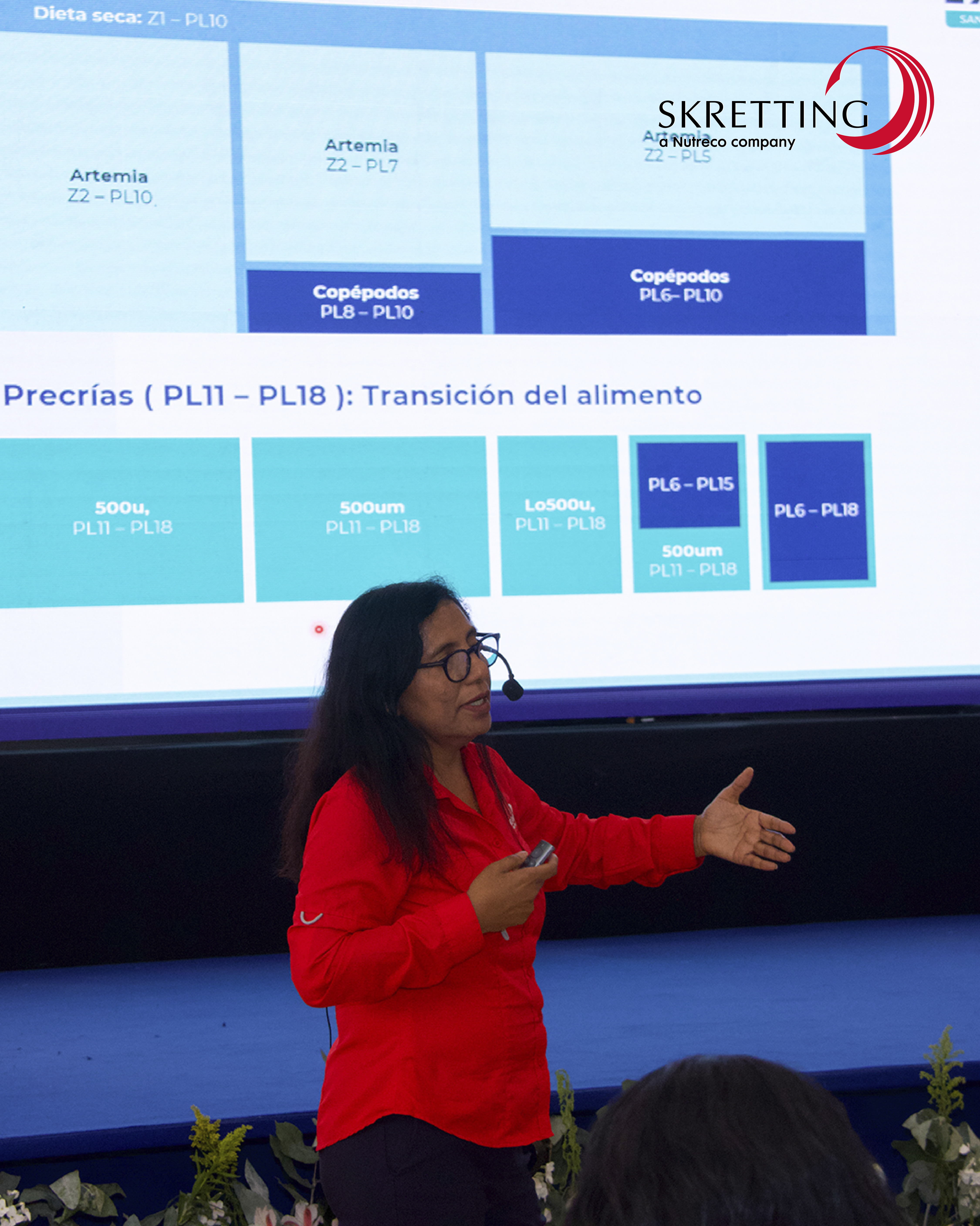 Además, contamos con la destacada intervención de Marita Monserrate, quien expuso sobre avances nutricionales de nueva generación para una transición exitosa del laboratorio a la precría, y mostró las innovaciones que Skretting introducirá este año para fortalecer la etapa inicial del cultivo.