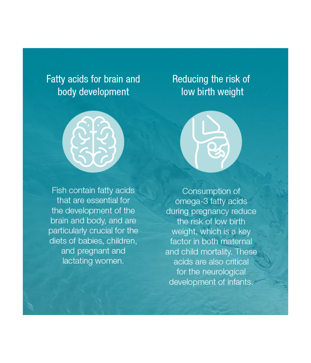 El consumo de ácidos grasos omega-3 durante el embarazo reduce el riesgo de bajo peso al nacer, que es un factor clave en la mortalidad materna e infantil. Estos ácidos también son críticos para el desarrollo neurológico de los bebés y se encuentran casi exclusivamente en el pescado, por lo que el consumo de pescado durante la lactancia y el embarazo es especialmente importante.