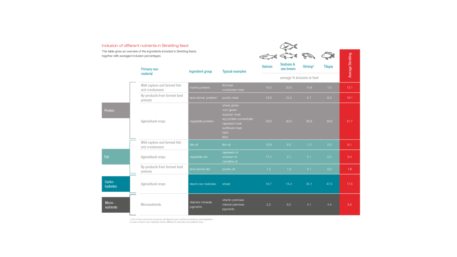 La harina de pescado y el aceite de pescado son dos de los ingredientes marinos más conocidos que a veces se utilizan en alimentos para la acuicultura. La harina de pescado es un polvo obtenido después de la cocción, el prensado, el secado y la molienda de pescado crudo fresco, mientras que el aceite de pescado es un líquido extraído del pescado cocido. Ambos se obtienen a partir de la captura de poblaciones de peces pequeños, óseos y azules de vida corta y rápido crecimiento para los que hay poca o ninguna demanda para el consumo humano. Los recortes no aptos para el consumo humano, y que resultan del procesamiento de productos del mar, contribuyen cada vez más a la producción de harina y aceite de pescado. Skretting tiene políticas estrictas para el abastecimiento sostenible de materias primas.