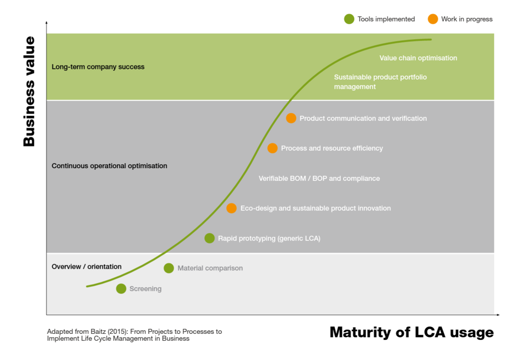 LCAの手法をビジネスに取り入れることは、一過性のタスクで終わらせるものではなく、長期的なプロセスです。長期的な成功のためには、ライフサイクルの考え方とマネジメントに関する新しい考え方を統合することが必要であり、段階的なアプローチで、大多数の部門を巻き込む必要があります。時間をかけてデータを改善することで、計算や判断をより強固で意味のあるものにすることができます。