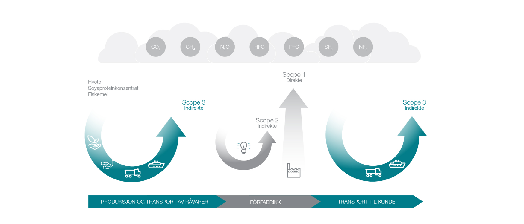 Det totale karbonfotavtrykket til et kilo fôr inkluderer ikke bare de direkte utslippene fra produksjon og transport av fôr til havbrukerne. Det inkluderer også en rekke indirekte utslipp, som høsting og dyrking av fôringredienser, foredling av ingrediensene, produksjon av mikronæringsstoffer, transport av råvarer med mer.