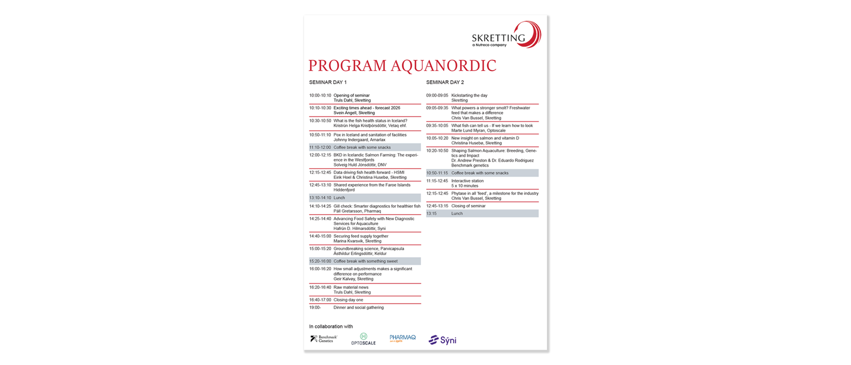 Join the annual Skretting seminar in Iceland. Join us for two days of industry updates, networking, and knowledge sharing. AquaNordic is the perfect arena to connect with peers and exchange experiences.