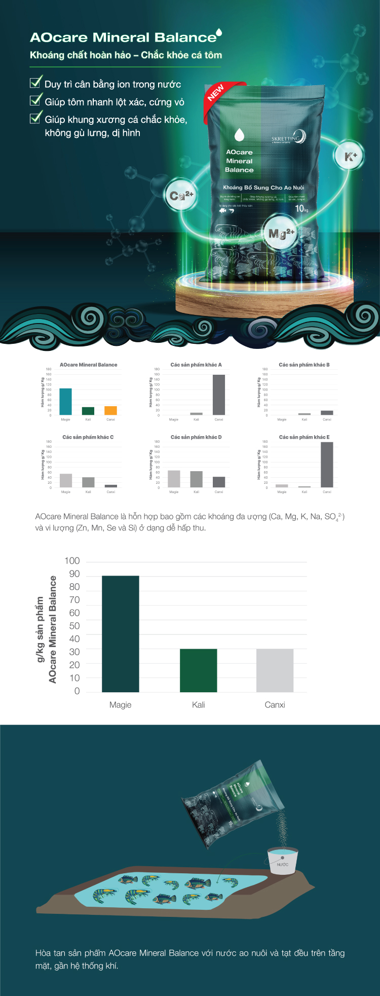 Thành phần nguyên liệu trong AOCare Mineral Balance có hàm lượng và hoạt tính sinh học cao, là sự kết hợp hoàn hảo giữa khoáng chất vi lượng và đa lượng. AOcare Mineral Balance đạt mức cân bằng giữa các thành phần ion chính Mg:Ca:K với tỉ lệ chuẩn 3:1:1 giúp tôm, cá có tỉ lệ sống cao. Sản phẩm thúc đẩy quá trình lột xác và nhanh cứng vỏ ở tôm, giúp cá có khung xương chắc khỏe, đảm bảo tốc độ tăng trưởng và phát triển của tôm cá.