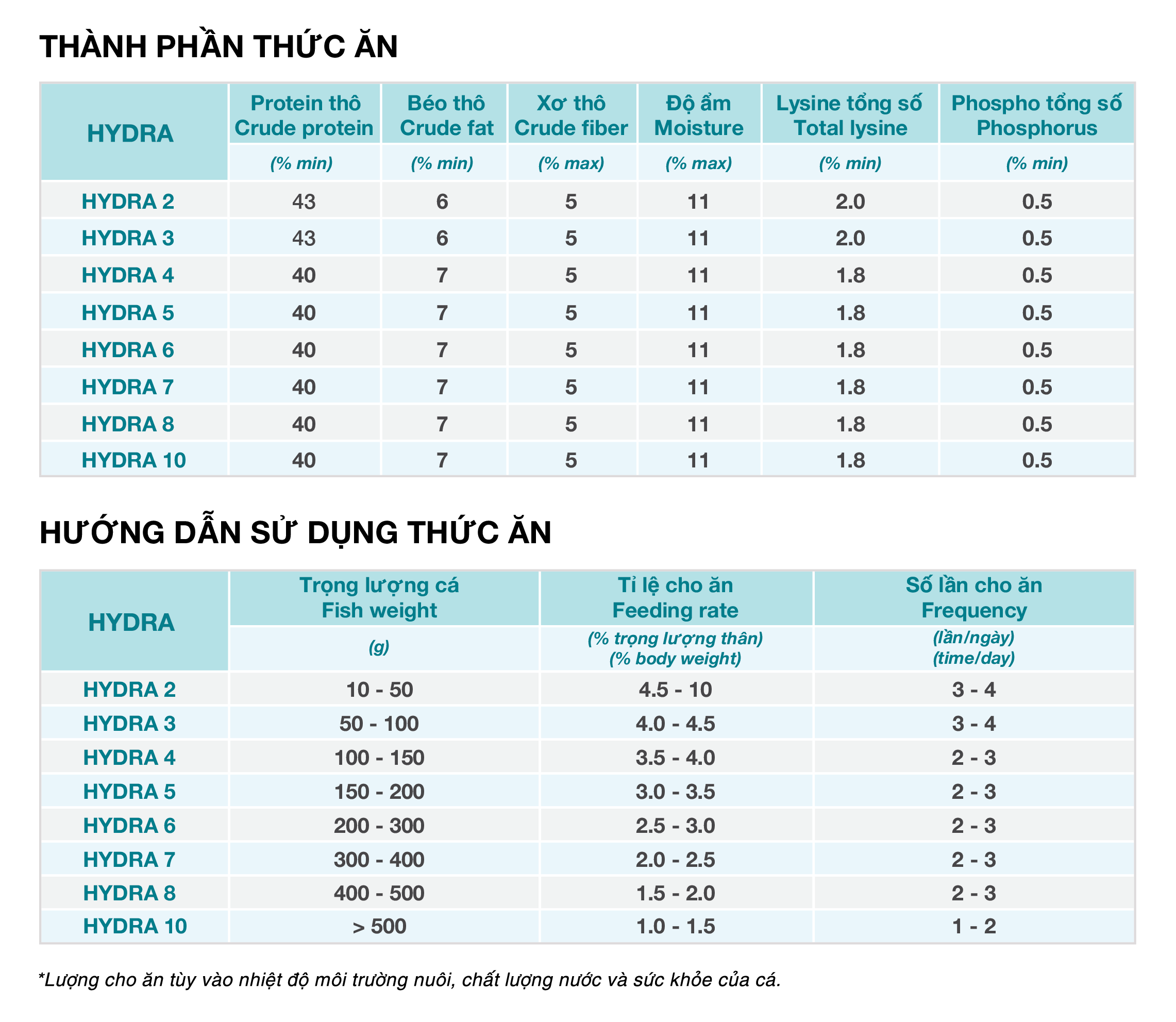 Hydra là loại thức ăn nổi chất lượng cao được thiết kế đặc biệt cho cá lóc nuôi trong ao ở mật độ cao. Sản phẩm góp phần mang lại lợi nhuận cao hơn cho người nuôi nhờ chi phí thức ăn hợp lý.