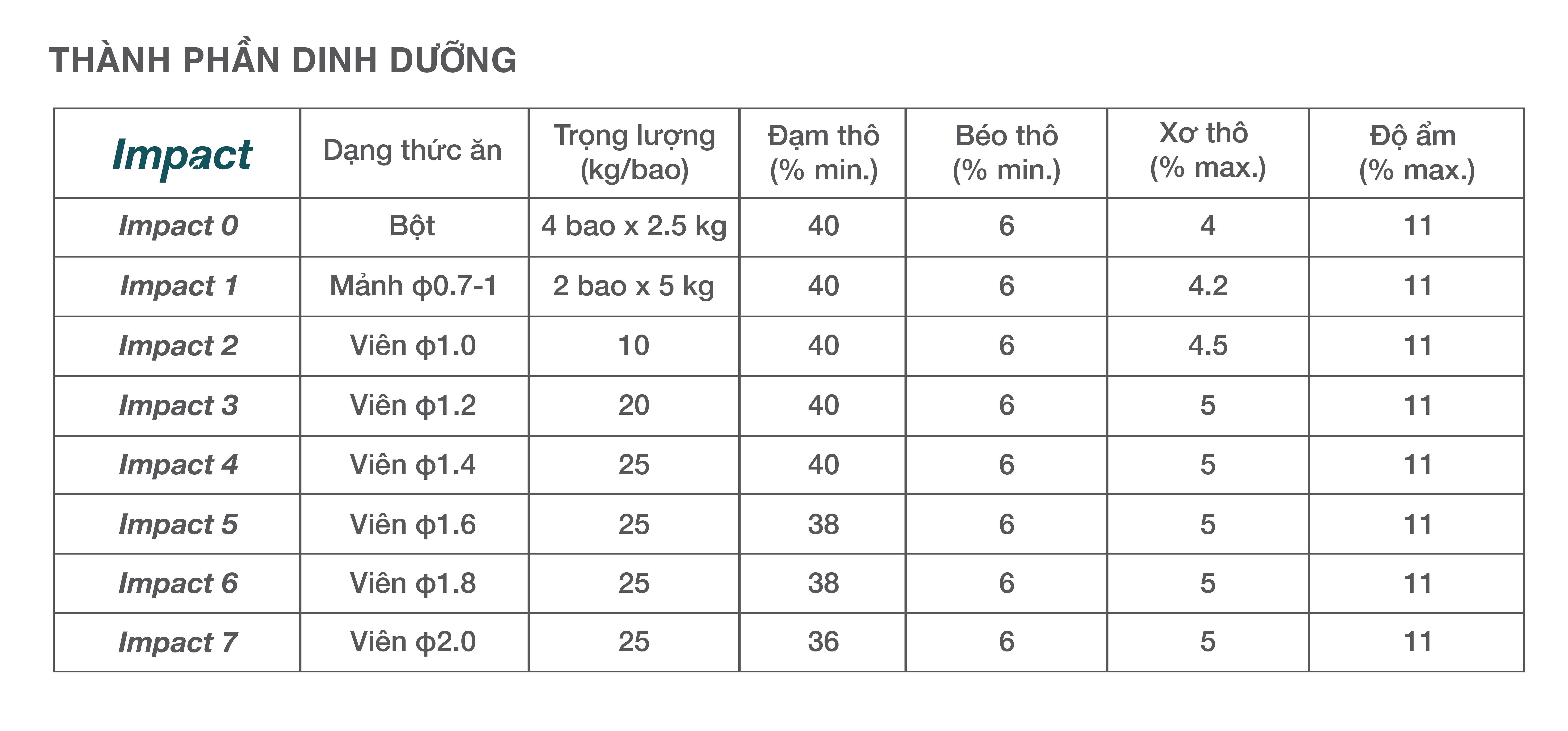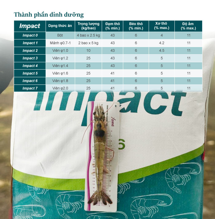 Công thức chuẩn hóa cải tiến và hàm lượng dinh dưỡng cân đối có trong IMPACT giúp người nuôi đáp ứng nhu cầu phát triển của tôm suốt giai đoạn thương phẩm. Với quy trình chọn lọc và kiểm định chất lượng nghiêm ngặt từ khâu nguyên liệu cho đến thành phẩm của Skretting, thức ăn IMPACT luôn đảm bảo được kết cấu và hàm lượng dinh dưỡng ổn định xuyên suốt quá trình lưu trữ và sử dụng.