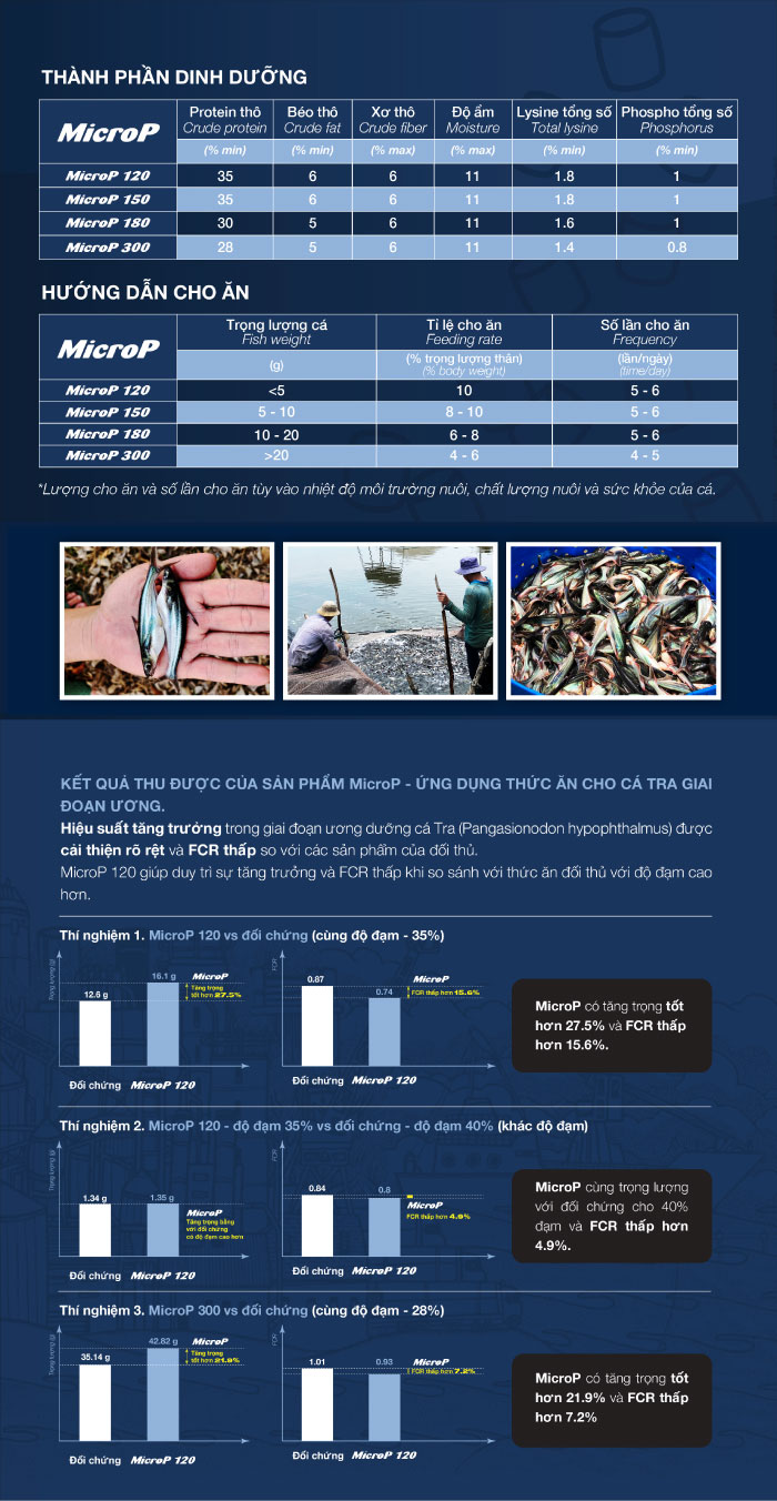 MicroP đảm bảo kích thước hạt tối ưu và dinh dưỡng cần thiết phù hợp cho từng giai đoạn phát triển nhằm đảm bảo cá hấp thu tốt và tăng trưởng vượt trội.