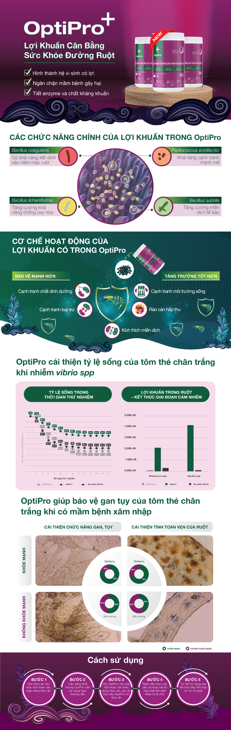 OptiPro là sản phẩm bổ sung vào thức ăn thủy sản, bao gồm hỗn hợp các loại vi khuẩn có lợi được tuyển chọn một cách cẩn thận giúp cải thiện sức khỏe toàn diện cho vật nuôi. Giúp ngăn chặn sự phát triển của các vi khuẩn gây bệnh trong hệ tiêu hóa