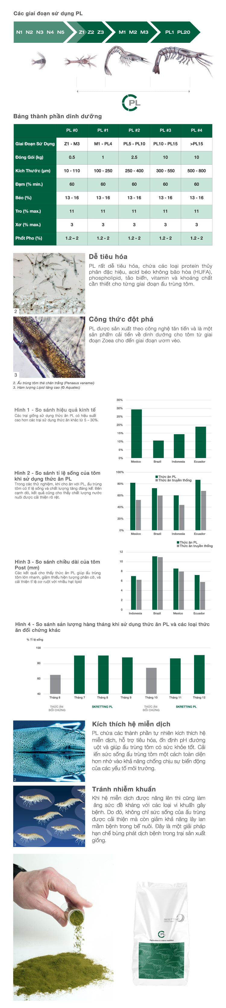 PL rất dễ tiêu hóa và được xây dựng với các protein thủy phân cụ thể, axit béo không bão hòa cao (HUFA), phospholipid, tảo biển, vitamin và khoáng chất để cung cấp đầy đủ dinh dưỡng cho tôm ấu trùng.