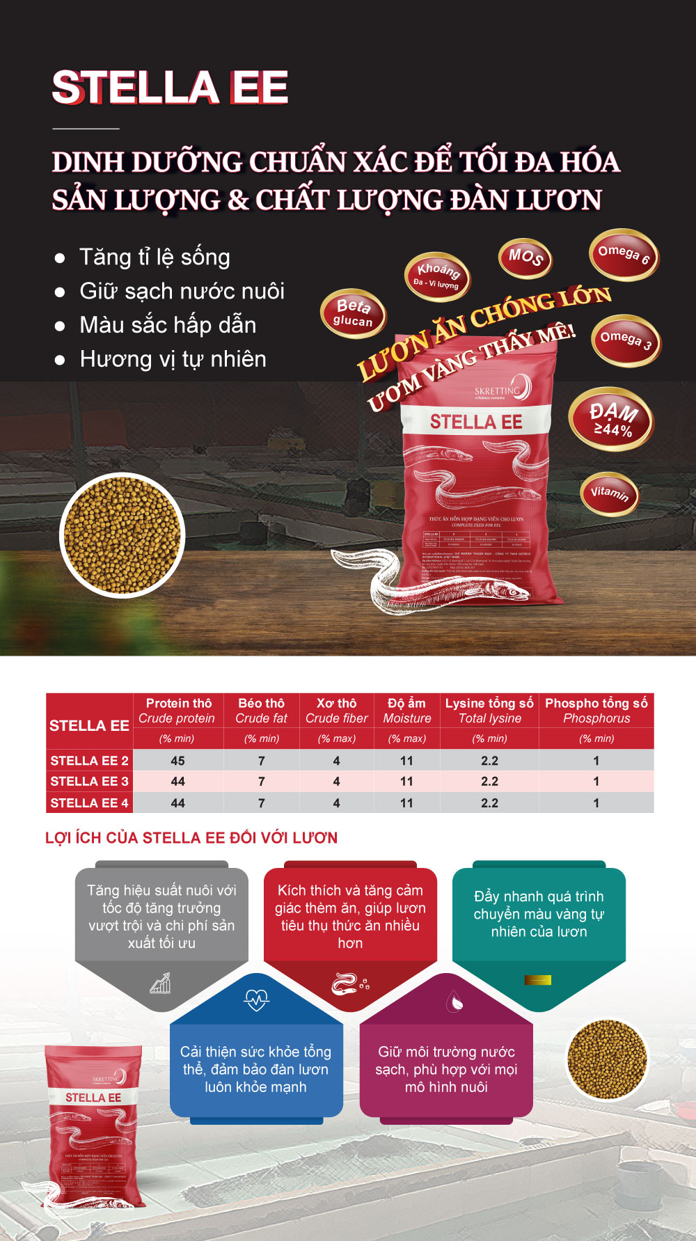 Với thành phần chất tạo màu tự nhiên, STELLA EE hỗ trợ tăng màu nhanh, giúp lươn đạt được sắc vàng tối ưu. Ngoài ra, sản phẩm còn góp phần cải thiện hiệu quả chi phí, thúc đẩy việc nuôi lươn bền vững hơn, đồng thời đảm bảo sức khỏe và chất lượng thịt vượt trội.