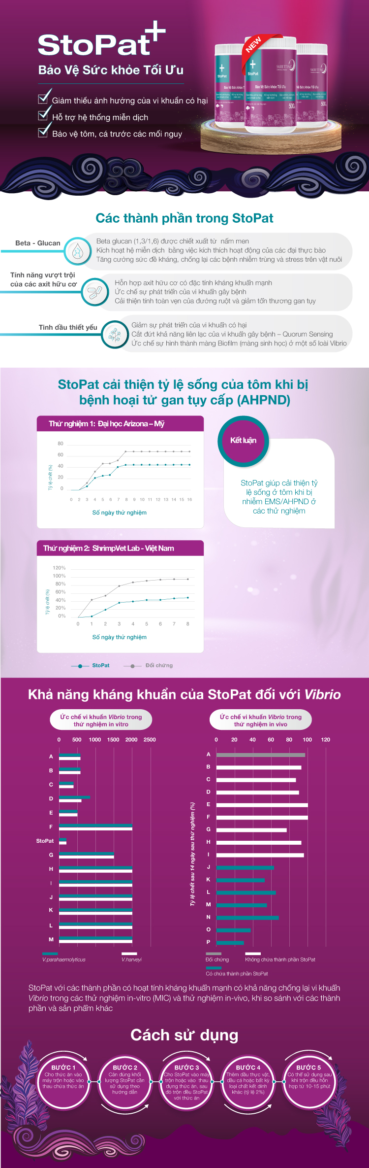 StoPat là chất bổ sung vào thức ăn thuỷ sản, giúp tăng cường và duy trì hệ vi sinh đường ruột, hỗ trợ vật nuôi trở nên khỏe mạnh trong xuyên suốt vụ nuôi. Sản phẩm là sự kết hợp của hỗn hợp axit hữu cơ (Formic acid, Acetic acid, Propionic acid) và Beta-glucan (β-Glucan)