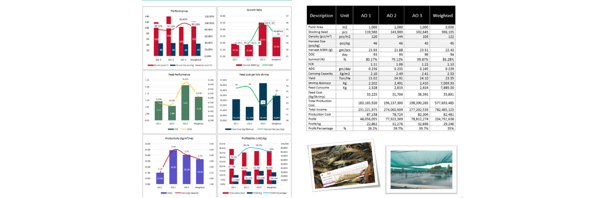 Điển hình, hệ số chuyển đổi thức ăn (FCR) dao động từ 1.06 đến 1.11, qua đó minh chứng chi phí thức ăn cho 1kg tôm chỉ khoảng 34.891 đồng. Với tổng chi phí đầu tư cho mỗi ao dao động từ 183 triệu đến 198 triệu đồng, lợi nhuận cho ao có thể dao động từ 231 triệu đến 277 triệu đồng. Như vậy, lợi nhuận bình quân đạt gần 67 triệu đồng/ao với tỷ suất lợi nhuận cao. Lợi nhuận chiếm gần 35%.