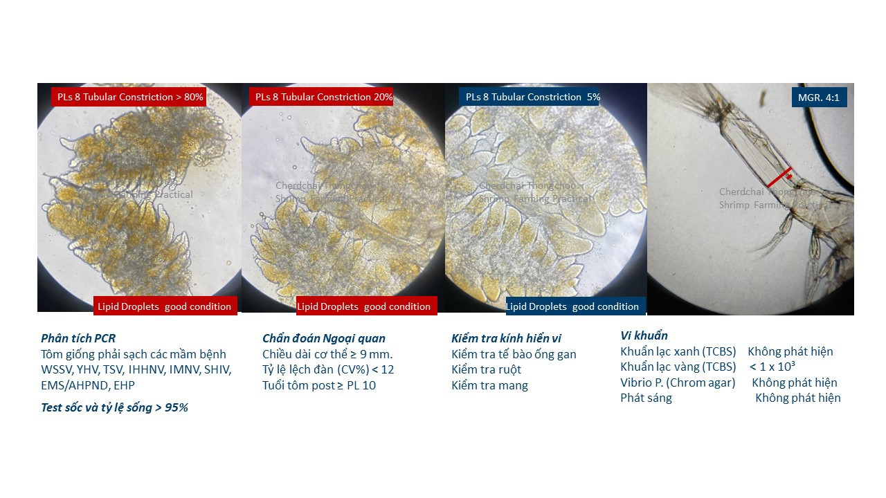 Cần kết hợp các quy trình quản lý sức khỏe tôm với nguồn giống chất lượng cao. Theo các chuyên gia của Skretting, tôm giống tốt cần có những đặc điểm sau: tôm postlarvae từ 10 – 12 ngày tuổi hay gọi là PL 10 -12. Ở giai đoạn này số gai trên chủy của tôm là 4, chiều dài thân tôm ≥9 mm, cân đối, đầy đủ phụ bộ, màu sắc tươi sáng, sắc tố trong, số lượng giọt dầu (lipid) đồng đều, chiếm hơn 90% khối lượng gan tụy. Đồng thời, đường ruột phải đầy đủ thức ăn: tỷ lệ cơ và ruột phải là 4:1. Các râu phải khép lại, trong khi hai nhánh cuống mắt và vành đuôi phải mở rộng. Bụng phải thon dài và cơ bụng đầy đặn. Mắt, đầu và chiều rộng của ruột đều phải to, không có dấu hiệu hoại tử ở bất kỳ vị trí nào trên cơ thể.