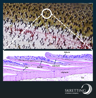 Do đó, lớp da nguyên vẹn với các chức năng hoạt động tốt là yếu tố quan trọng để ổn định sức khỏe cá. Để tăng cường sức khỏe da, từ đó nâng cao sức khỏe cá, việc giảm các yếu tố gây căng thẳng và duy trì chất lượng nước tối ưu là điều cần thiết. Bên cạnh đó, việc cung cấp dinh dưỡng chất lượng cao và phù hợp sẽ hỗ trợ cá vượt qua những giai đoạn thách thức.