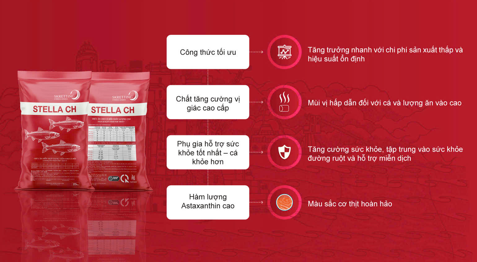 Stella CH được phát triển dựa trên nhu cầu dinh dưỡng đặc biệt của cá hồi vân và 4 yếu tố chính được cân nhắc là: (1) Đạm và axit amin dành riêng cho sự phát triển cơ, (2) Năng lượng cao và cải thiện việc sử dụng chất béo, (3) Mức vitamin và khoáng chất tối ưu để tăng trưởng nhanh, và (4) Hỗ trợ sức khỏe.