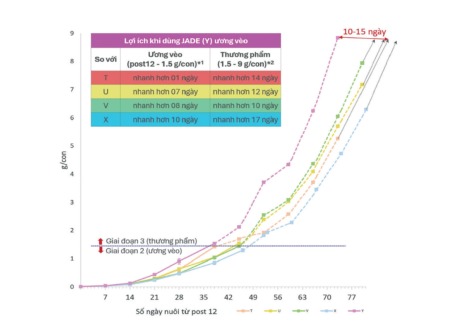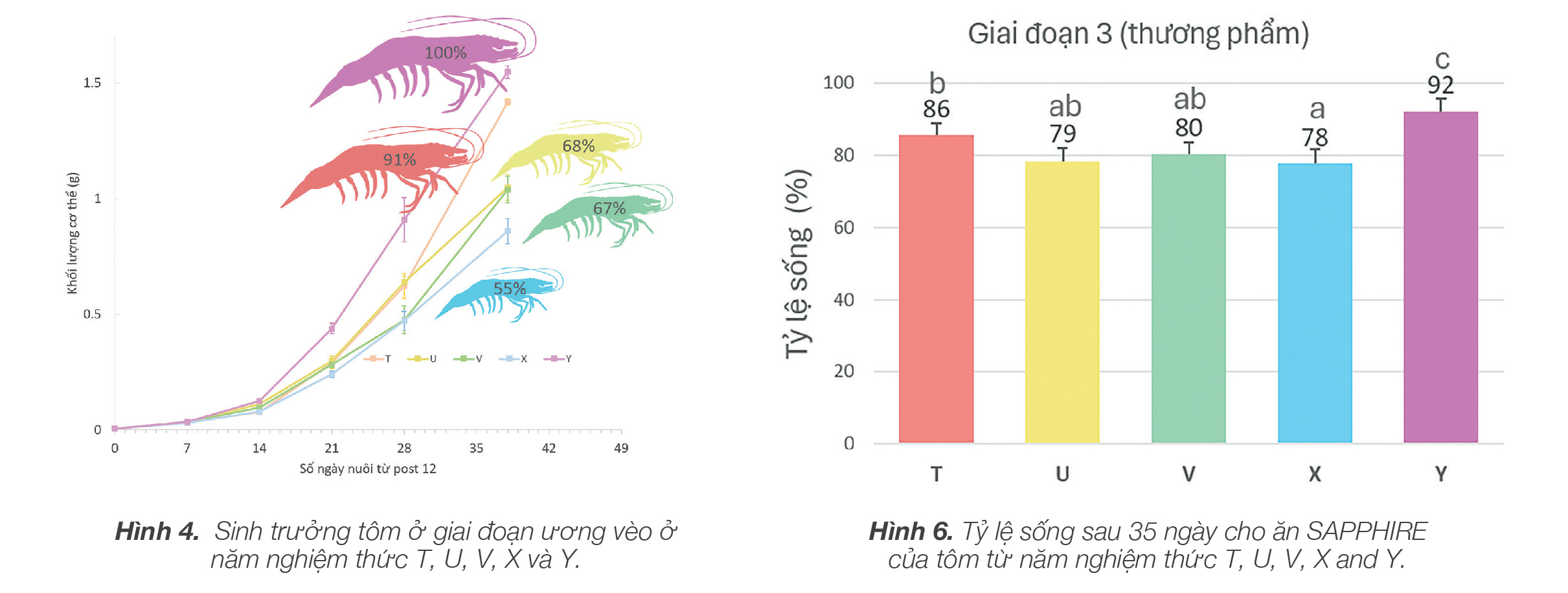Trong thí nghiệm này, chúng tôi kết thúc giai đoạn 2 (ương vèo) khi tôm đạt khoảng 1,5 g và chuyển sang giai đoạn 3, với tôm ở tất cả 05 nghiệm được cho ăn cùng một loại thức ăn, SAPPHIRE (Skretting), trong 05 tuần. Kết quả cho thấy, tôm ở nghiệm thức Y (cho ăn JADE ở giai đoạn 2), tiếp tục có tốc độ sinh trưởng cao nhất ở giai đoạn 3, so với các nghiệm thức còn lại, khối lượng cơ thể đạt 9g, tăng gần 6 lần sau 35 ngày nuôi.