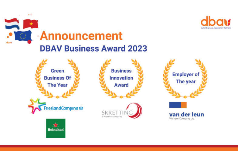 Hiệp hội Doanh nghiệp Hà Lan Việt Nam (DBAV) đã công bổ những doanh nghiệp đạt giải thưởng DBAV Sustainability Champions 2023. Giải thưởng gồm 4 hạng mục nhằm tôn vinh các doanh nghiệp Hà Lan đã có những đóng góp đáng kể đối với cộng đồng và xã hội, trong đó thể hiện rõ nhất là giảm tác động đến môi trường.