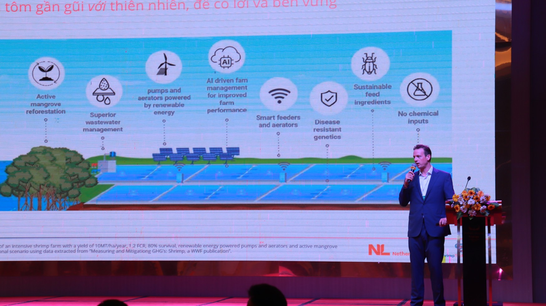 Ông Eric de Vaan, Tổng Giám đốc Nutreco Vietnam, có bài phát biểu với chủ đề “Skretting Vietnam và tham vọng hướng đến nuôi trồng thủy sản không phát thải ròng”.