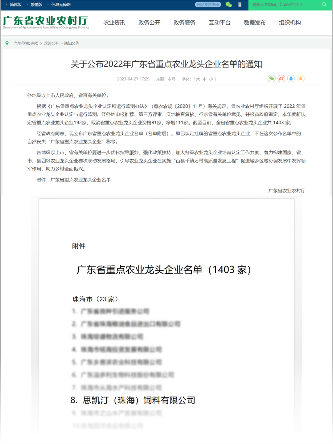 近日,广东省农业农村厅发布2022年广东省重点农业龙头企业名单,珠海23家企业上榜!