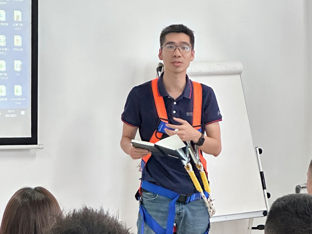 下半年HSE的重心依旧是保障大家上班过程中的人身安全,像我身上的这个安全绳,我们的同事工作时需要穿上一整天,穿在身上一天是什么感受的,这不仅只是一次体验,除了保障安全,也需要更多地考虑到人的舒适性跟可操作性。